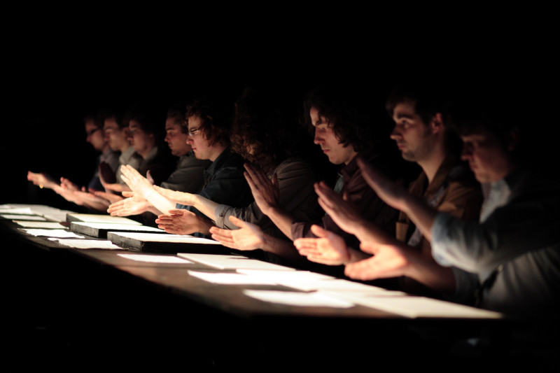 ‘Here, the stage is not only a podium, it is a space where a mise en scene is created with light and symmetric changes. The music that sounds, is amorphous, to say the least. It too has to find its contours. It also wanders. From minimal music to Helmut Lachenmann and back to Cage and Charles Ives, but also between centuries.’ Tim Gorbauch, Frankfurter Rundschau – 6 januari 2009