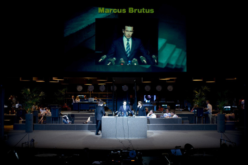 Ivo van Hove stages three plays by Shakespeare – Coriolanus, Julius Caesar, Antonius & Cleopatra – as a continuous performance presenting the political act. The ideals, opinions and personal aims of politicians are simply put next to each other, Shakespeare does not take sides. The three Roman Tragedies show politics in all facets.