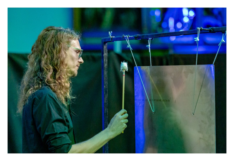 Met 16 lampen spelen de percussionisten een ritmisch spel in Nocturne van Màtyàs Wettl.
