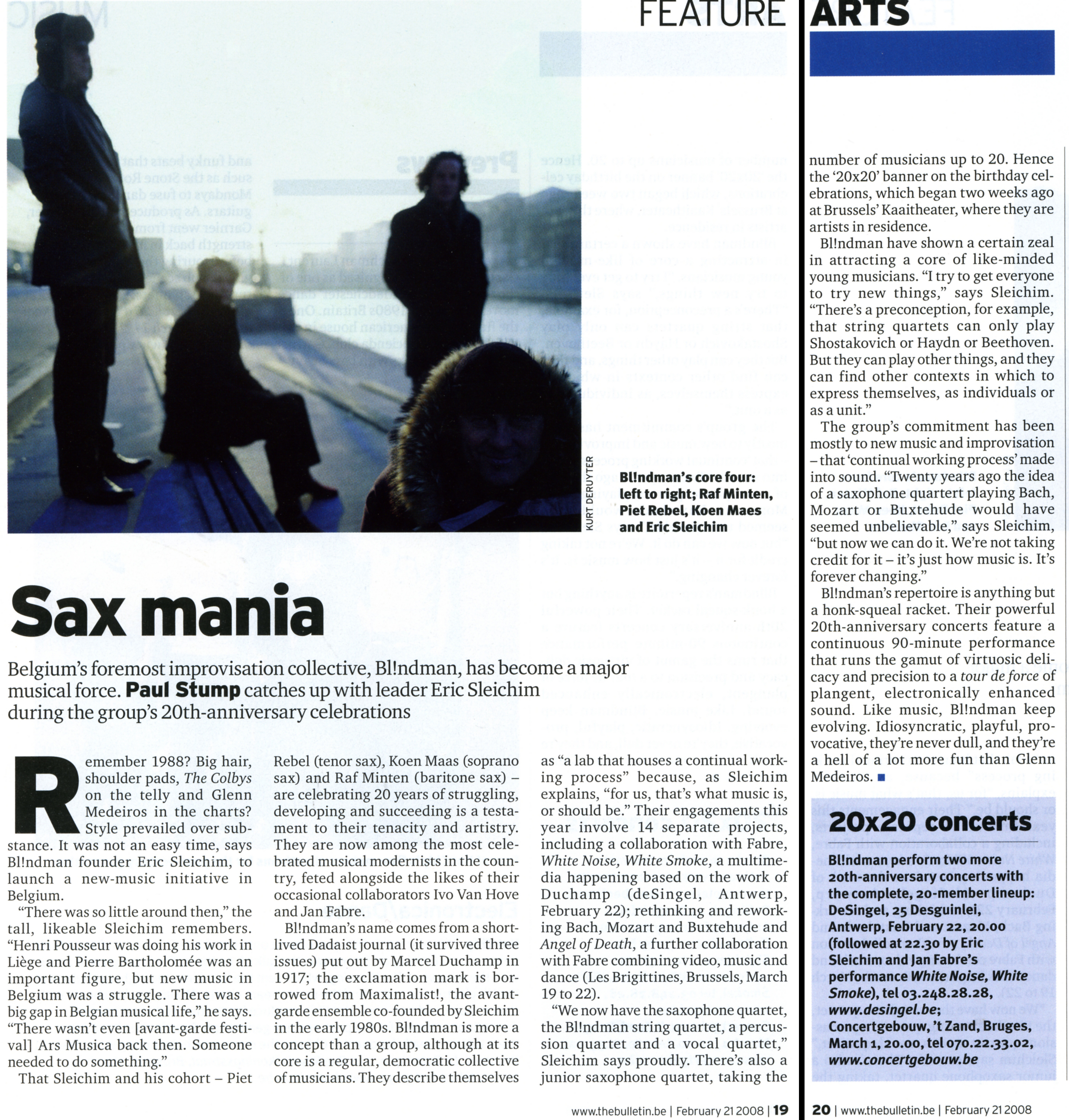 20×20 represents a swirling anniversary celebration. In 2008, BL!NDMAN is celebrating its twentieth anniversary with all twenty musicians from the collective (the original BL!NDMAN saxophone quartet plus the four ‘young’ BL!NDMAN [4×4] quartets) and the artists Jan Fabre, Anouk De Clercq and Kris Verdonck.