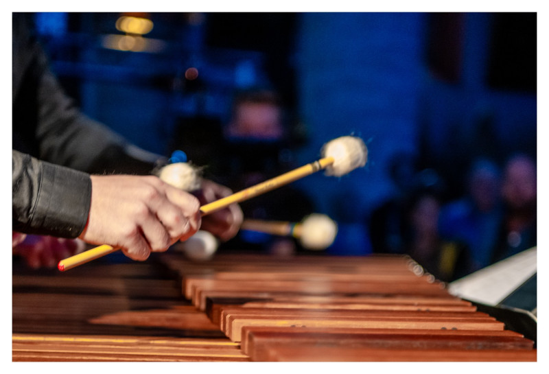 Met 16 lampen spelen de percussionisten een ritmisch spel in Nocturne van Màtyàs Wettl.